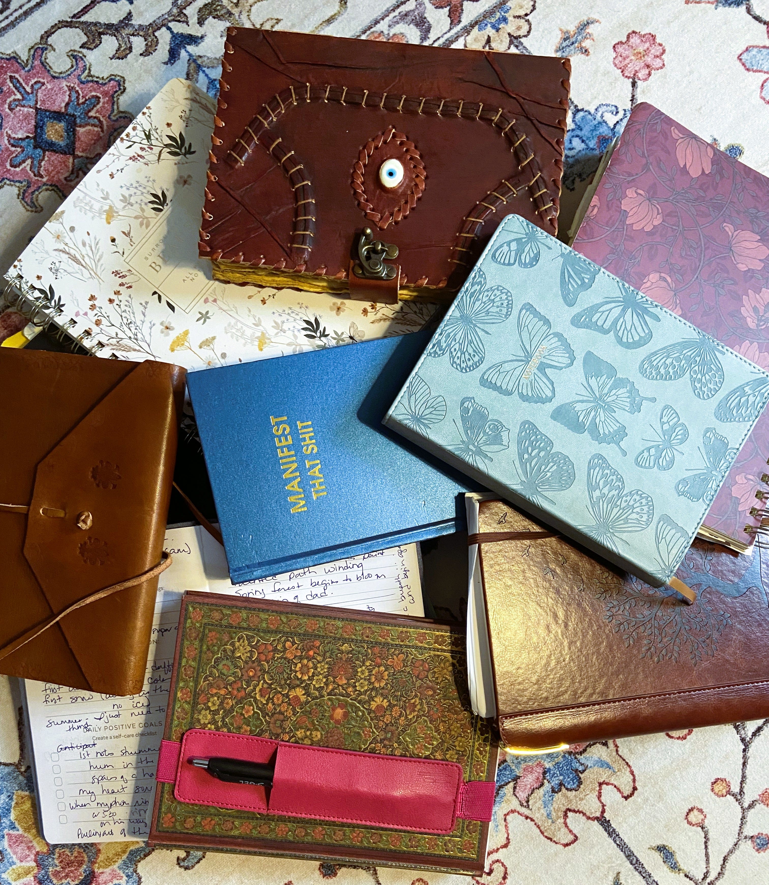 I’ve added tabs to designate sections to some, and most have sticky notes or paper clips to mark something I want to remember as possibly important. I try to keep track of dates and writing prompts that guide my imagination, but I’m inconsistent – and I forgive myself this imperfection.